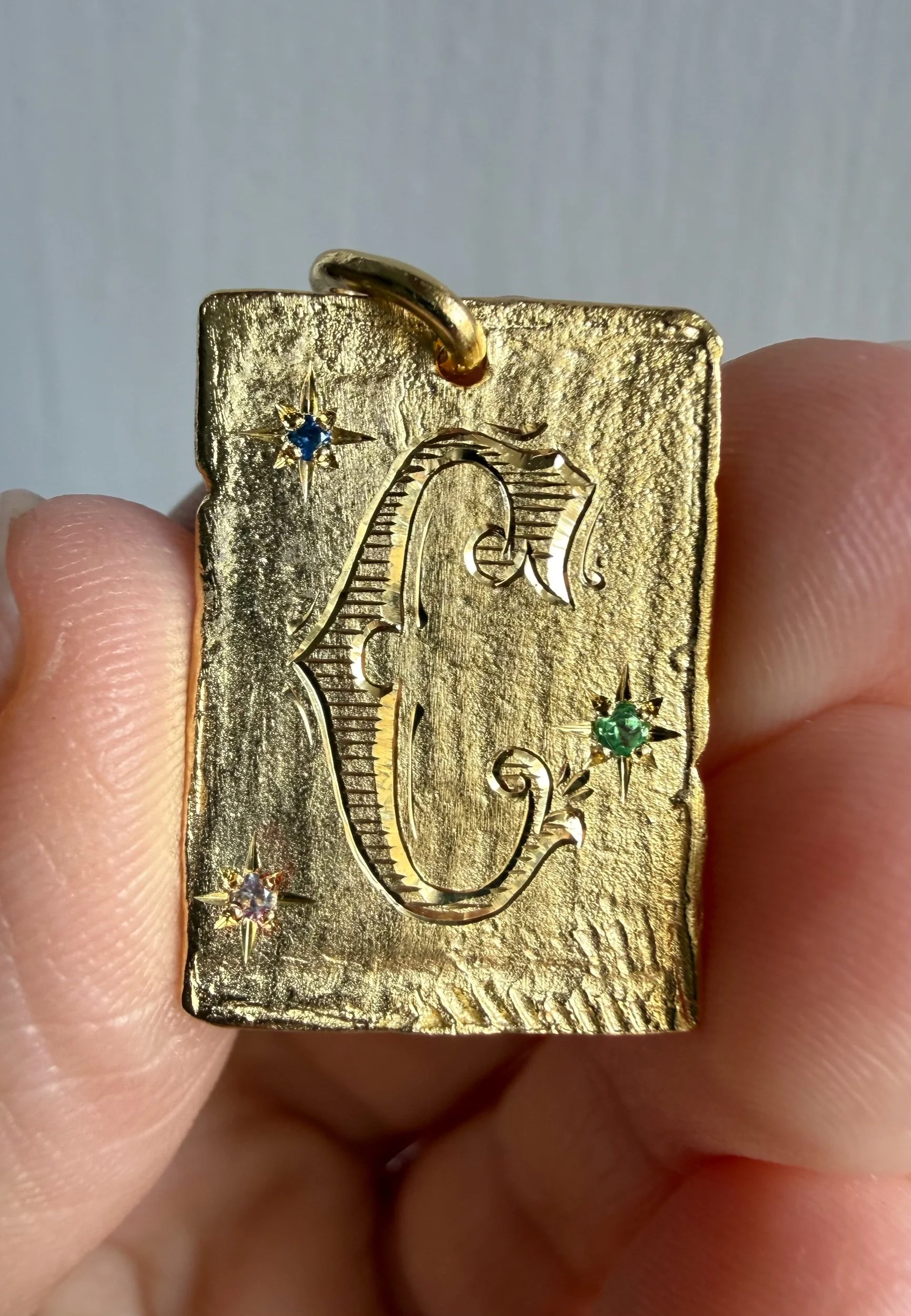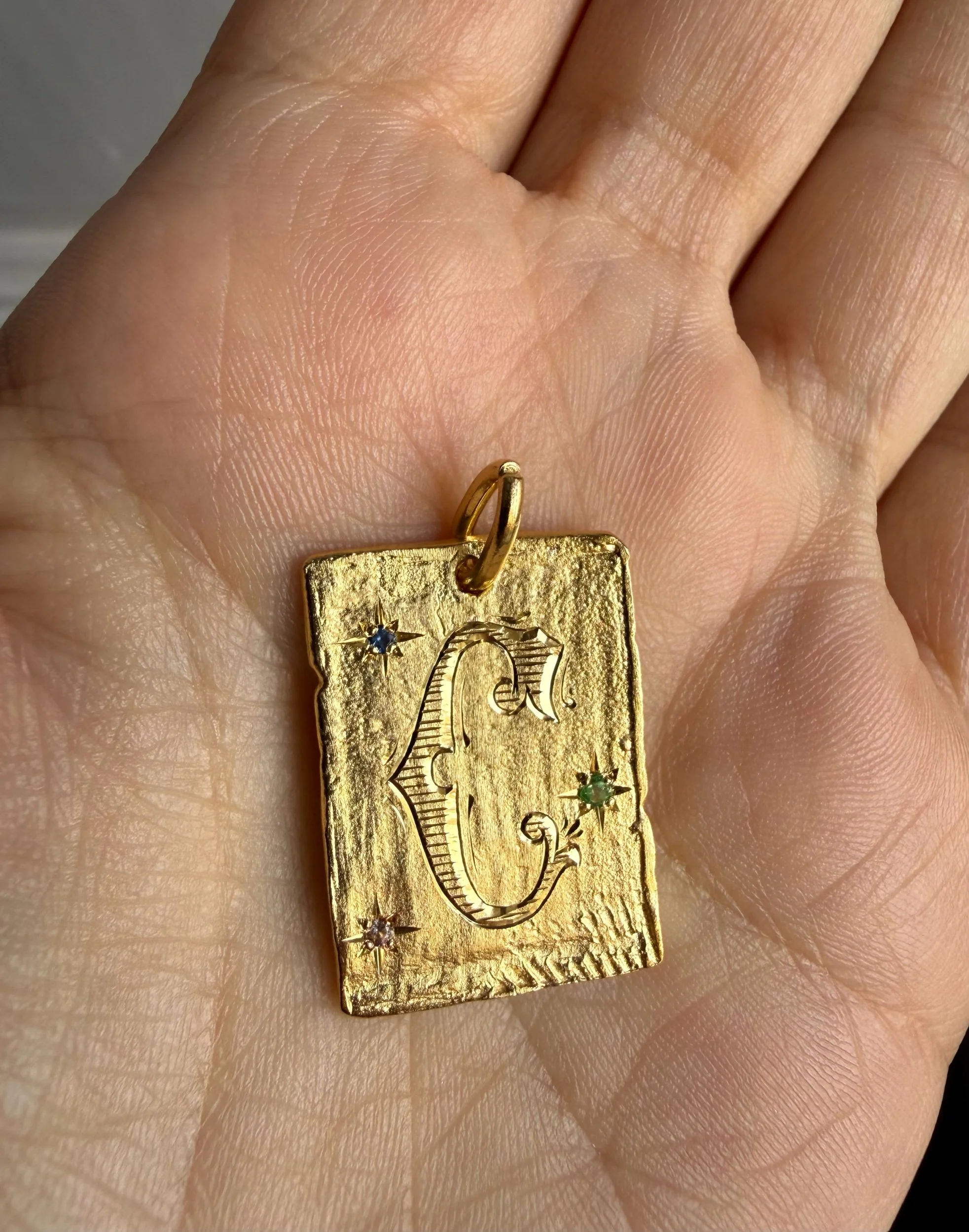 Medalla organica y con textura donde se puede grabar una bonita inicial de estilo clásico, con grabado de lustre (esas pequeñas rallitas que le aportan brillo). También lleva tres zafiros de color (verde, rosa y azul) engastados en estrella.
